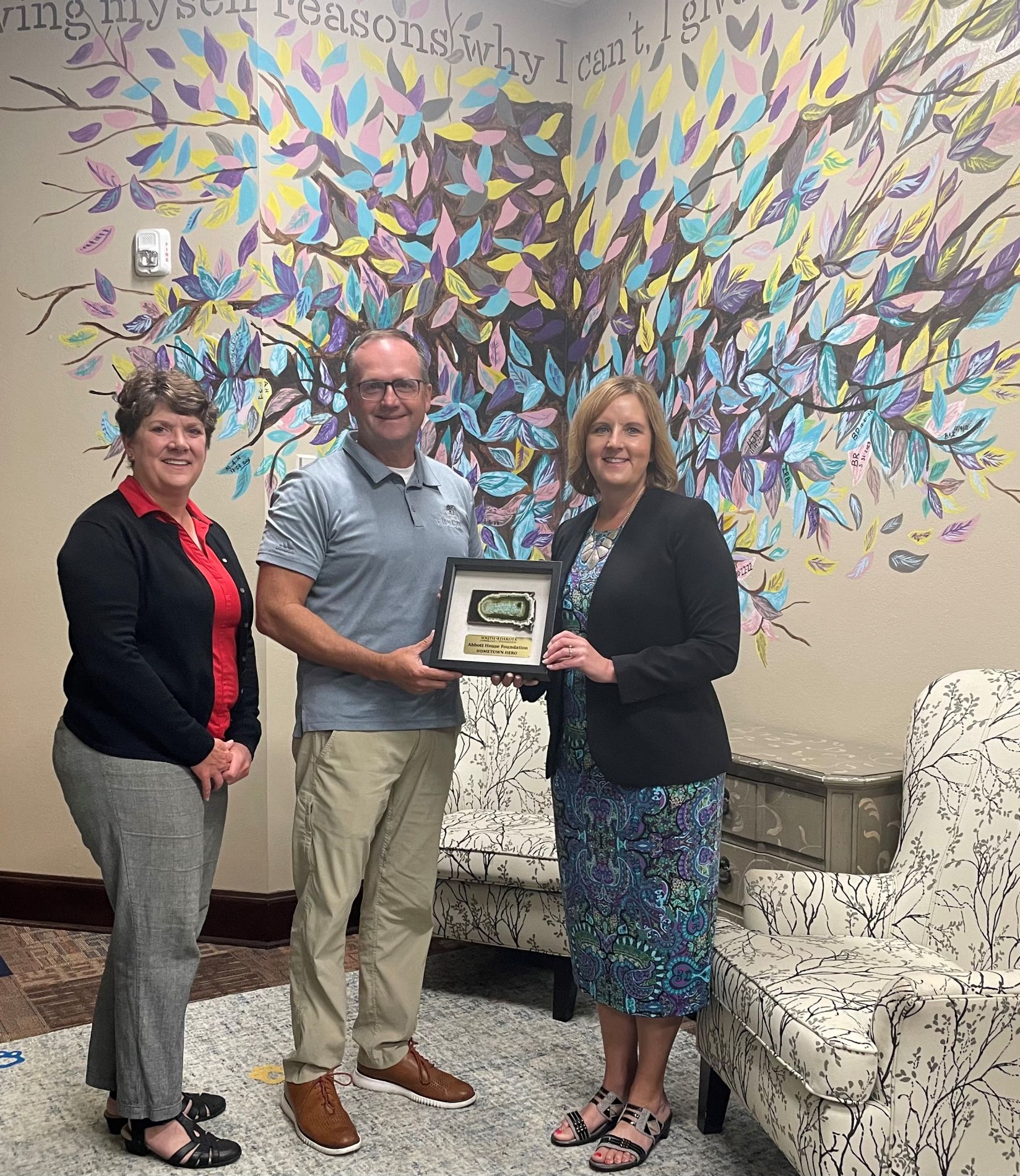 Mitchell, SD – The Hometown Hero Award is presented to South Dakota businesses and individuals who support and advocate for their neighbors and communities. On June 20, 2023, Stephanie Judson, the South Dakota Community Foundation (SDCF) President and Chief Executive Officer, presented the Hometown Hero Award to Abbott House. Eric Klooz, Abbott House Executive Director, and Virginia Wishard Lambert, the Abbott House Director of Development, accepted the award in front of the tree mural inside the Abbott House PRTF building. “This is our story,” Klooz said in reference to the mural, “our kids sign a leaf when they finish their program with us. Each signed leaf is a different child, a different story.”
